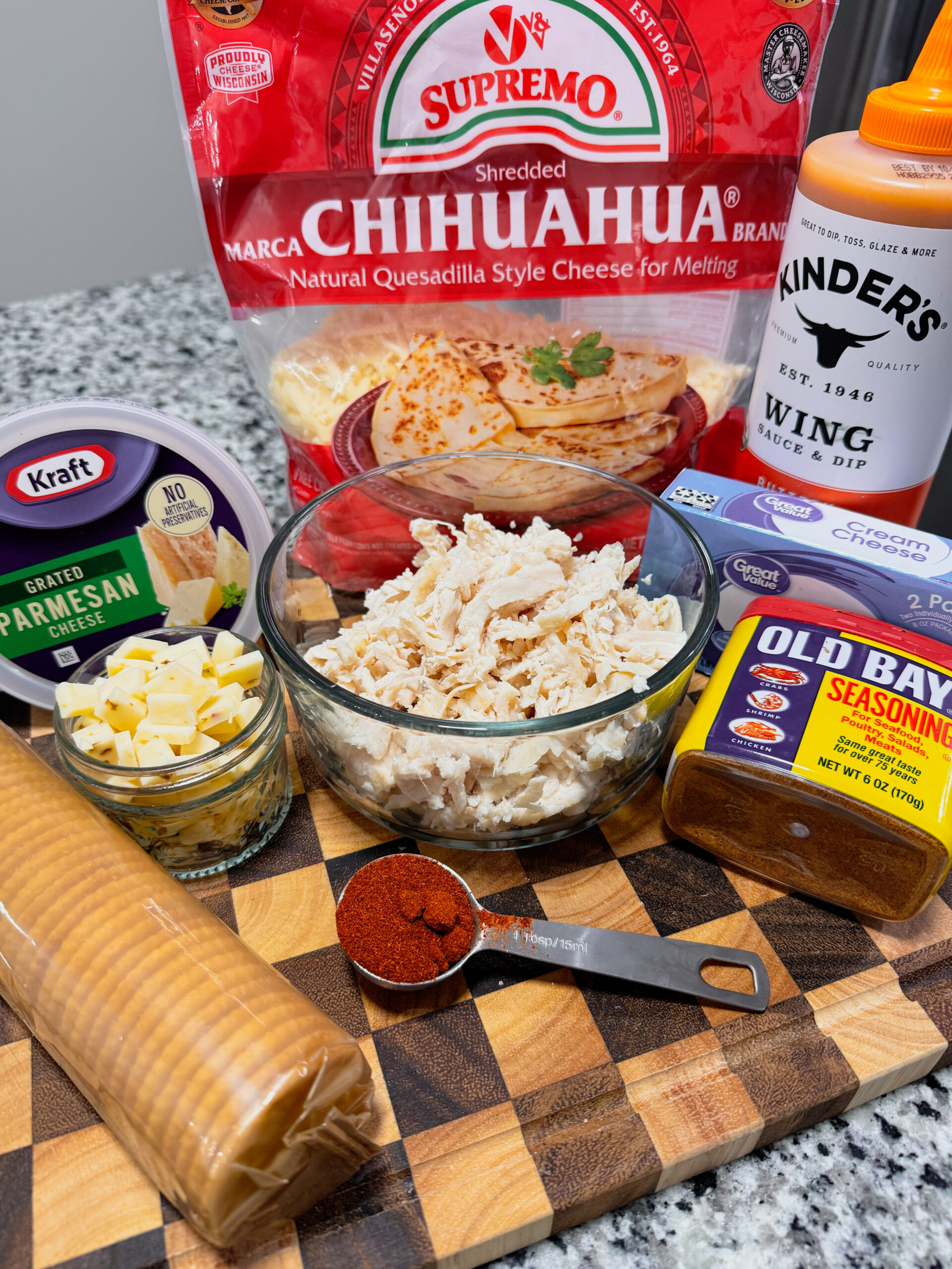 - Step 2: Now layer the diced cream cheese, shredded Chihuahua cheese, diced pepper jack, buffalo sauce, Old Bay Seasoning, and paprika on top. Do not mix. It will all melt nicely soon, don't worry!