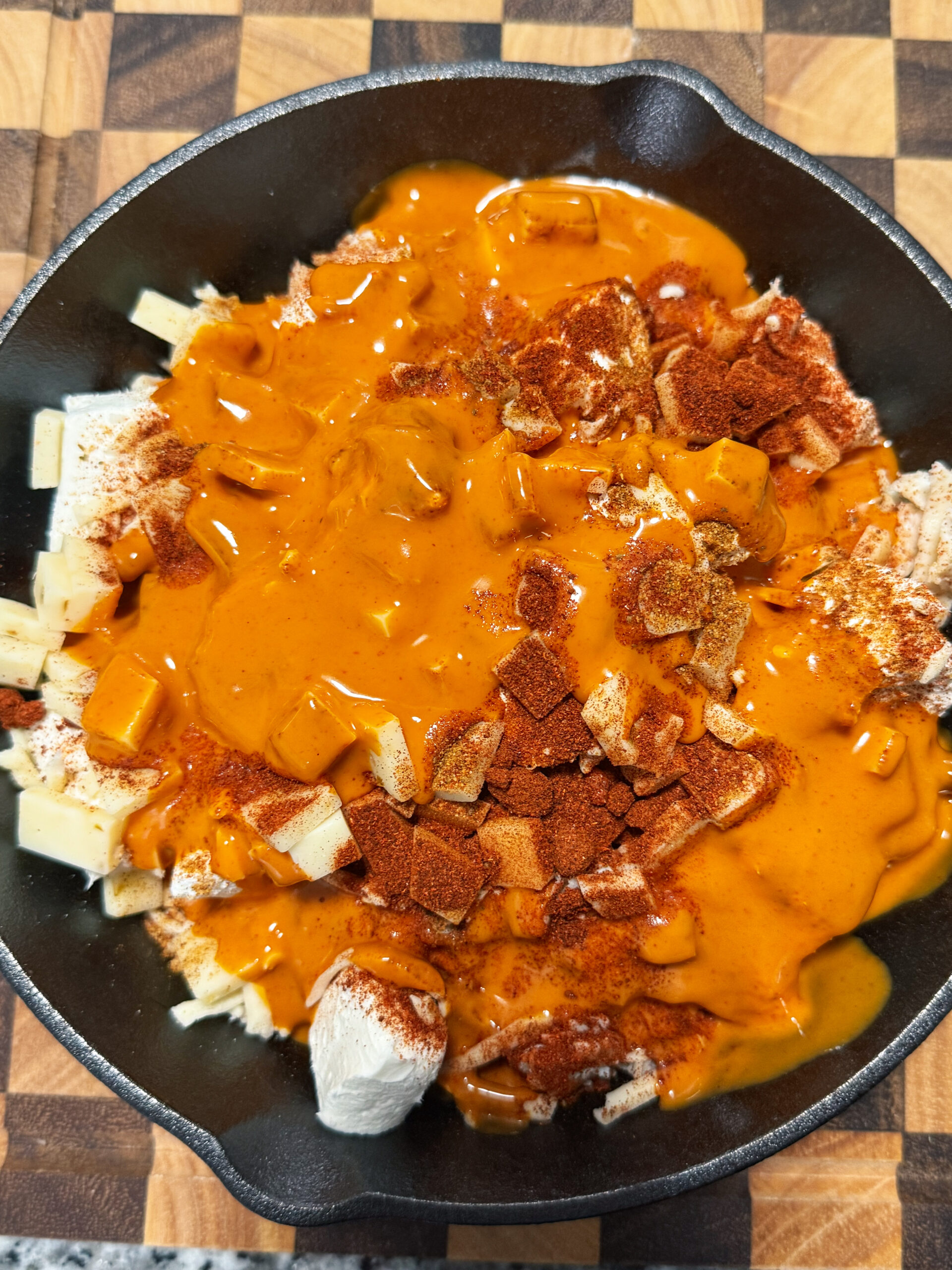 - Layer the diced cream cheese, shredded Chihuahua cheese, diced pepper jack, buffalo sauce, Old Bay Seasoning, and paprika on top. Do not mix.