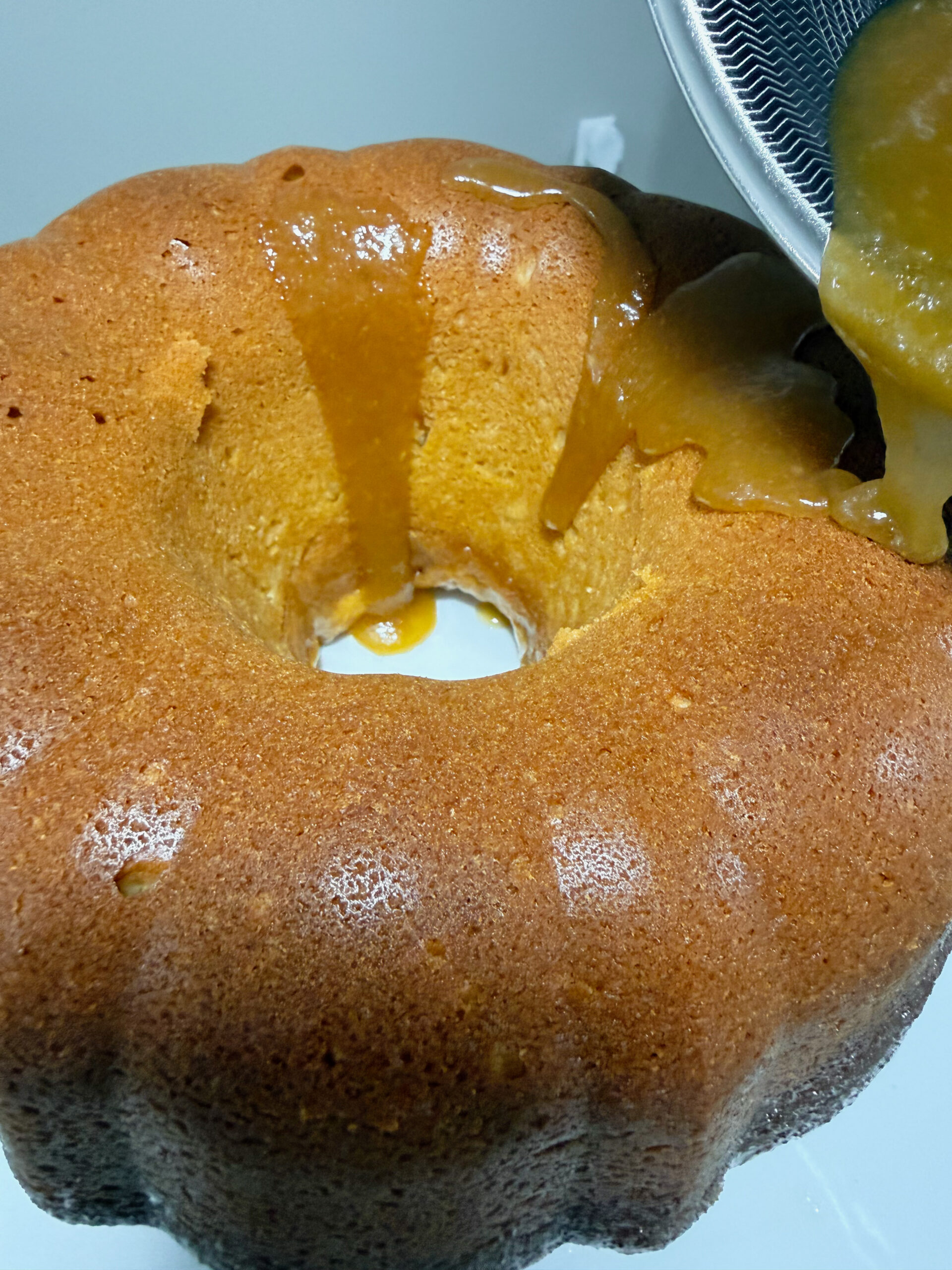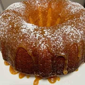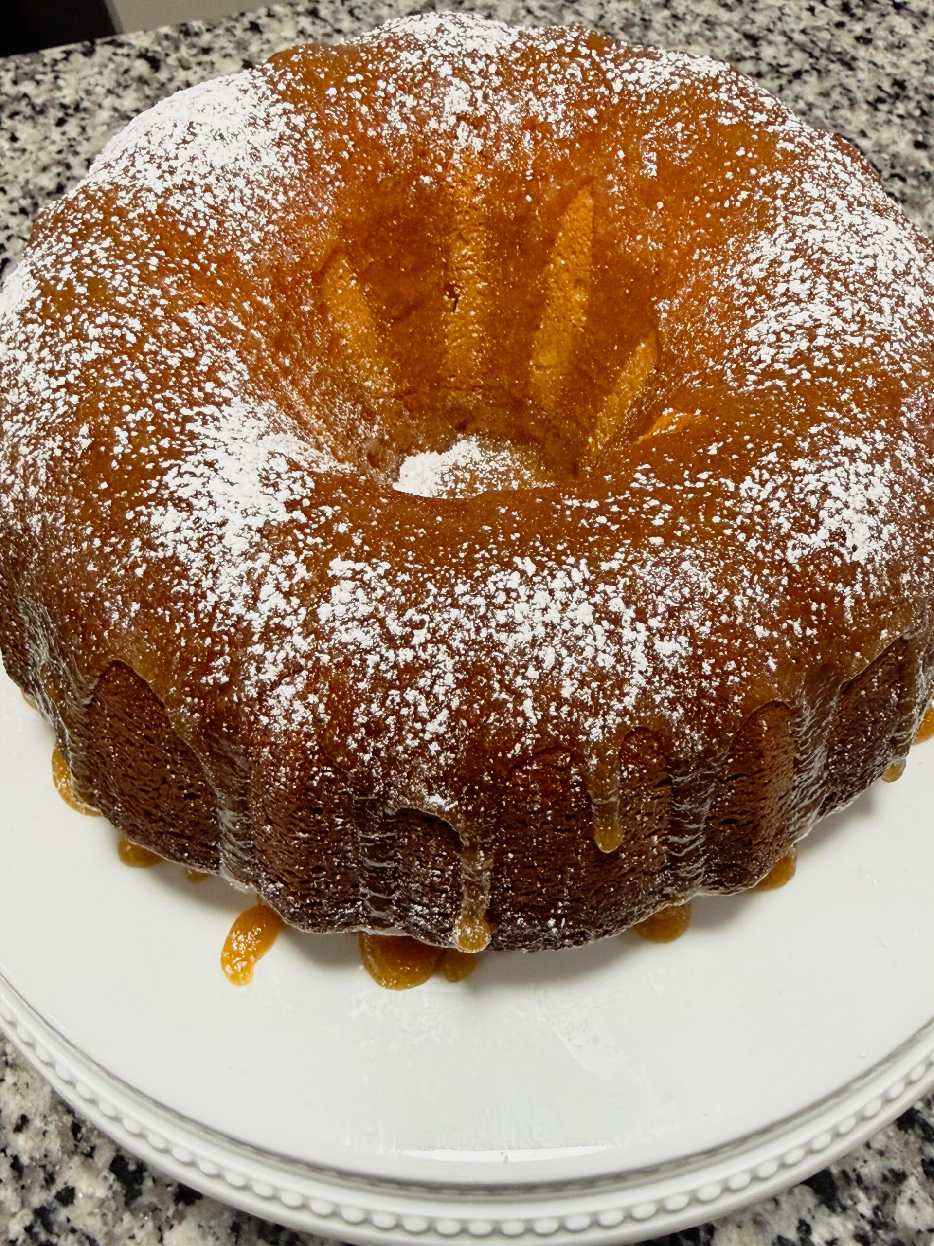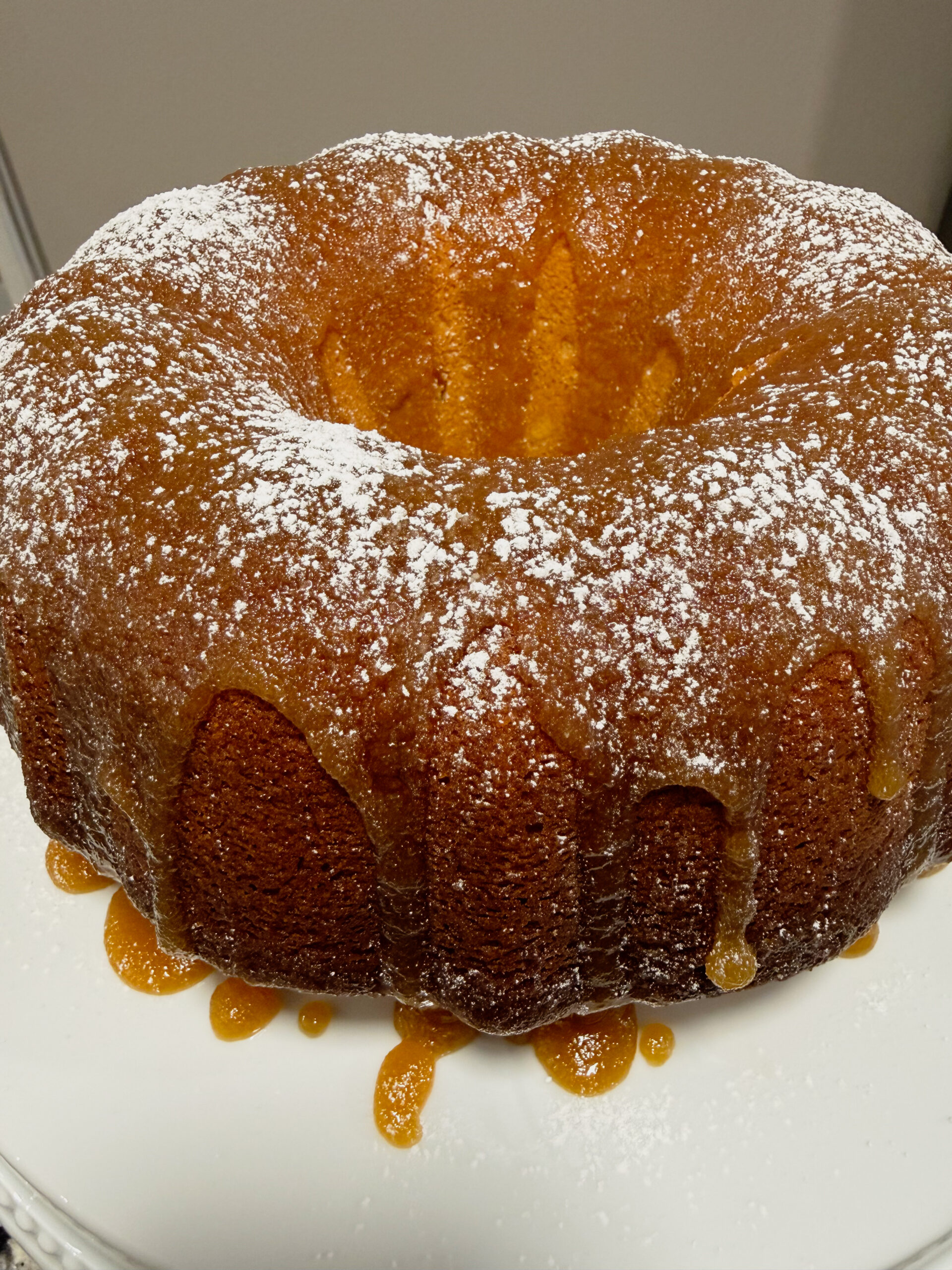 - Step 8: Now pour the remaining glaze over the top. It will naturally fall down the sides. Finally, dust with powdered sugar, let the cake cool completely, then slice and serve. Enjoy!