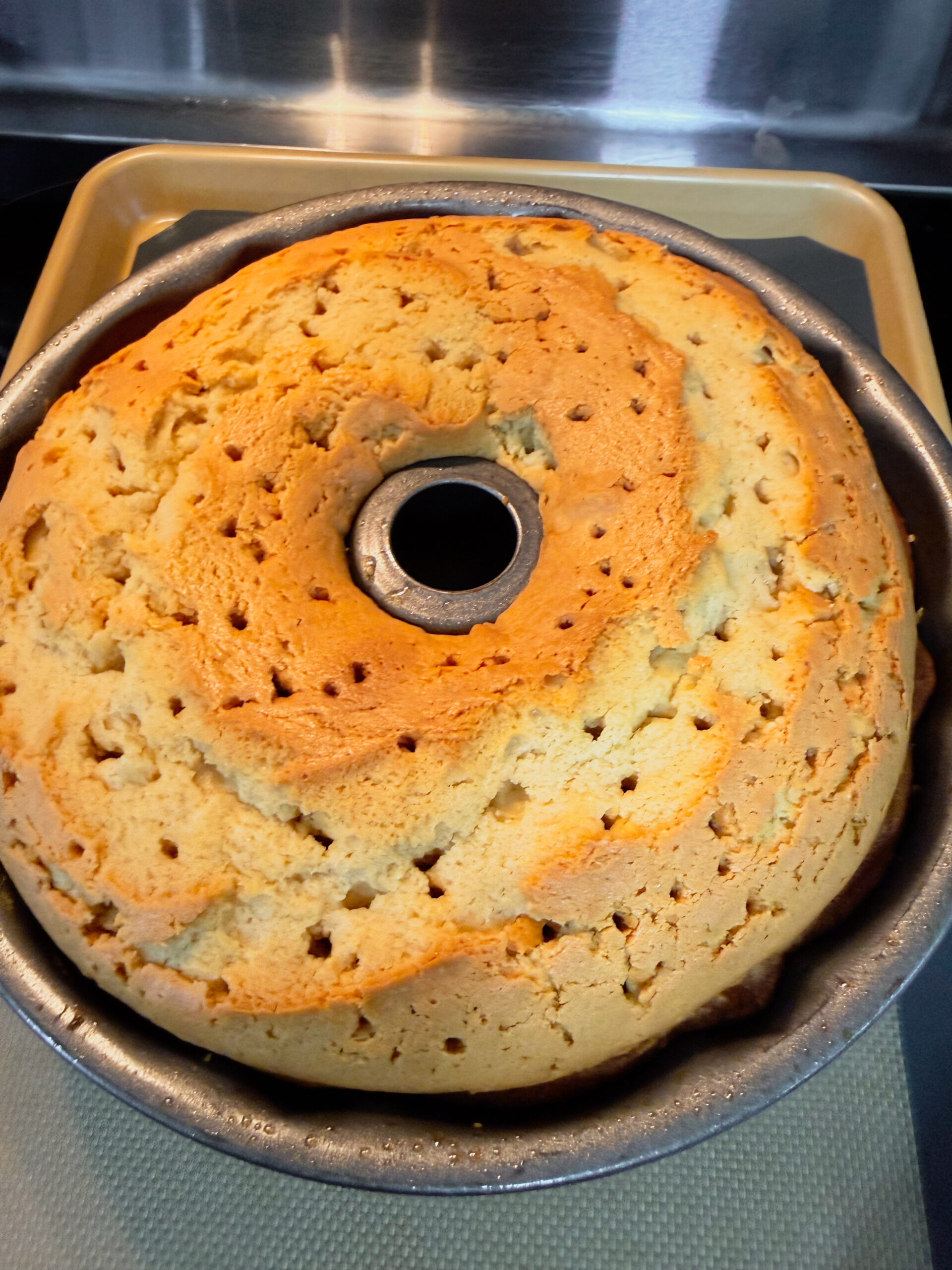 - Step 6: When the cake finishes baking, poke holes all over the surface, then slowly pour half of the glaze over the cake so it soaks in.
