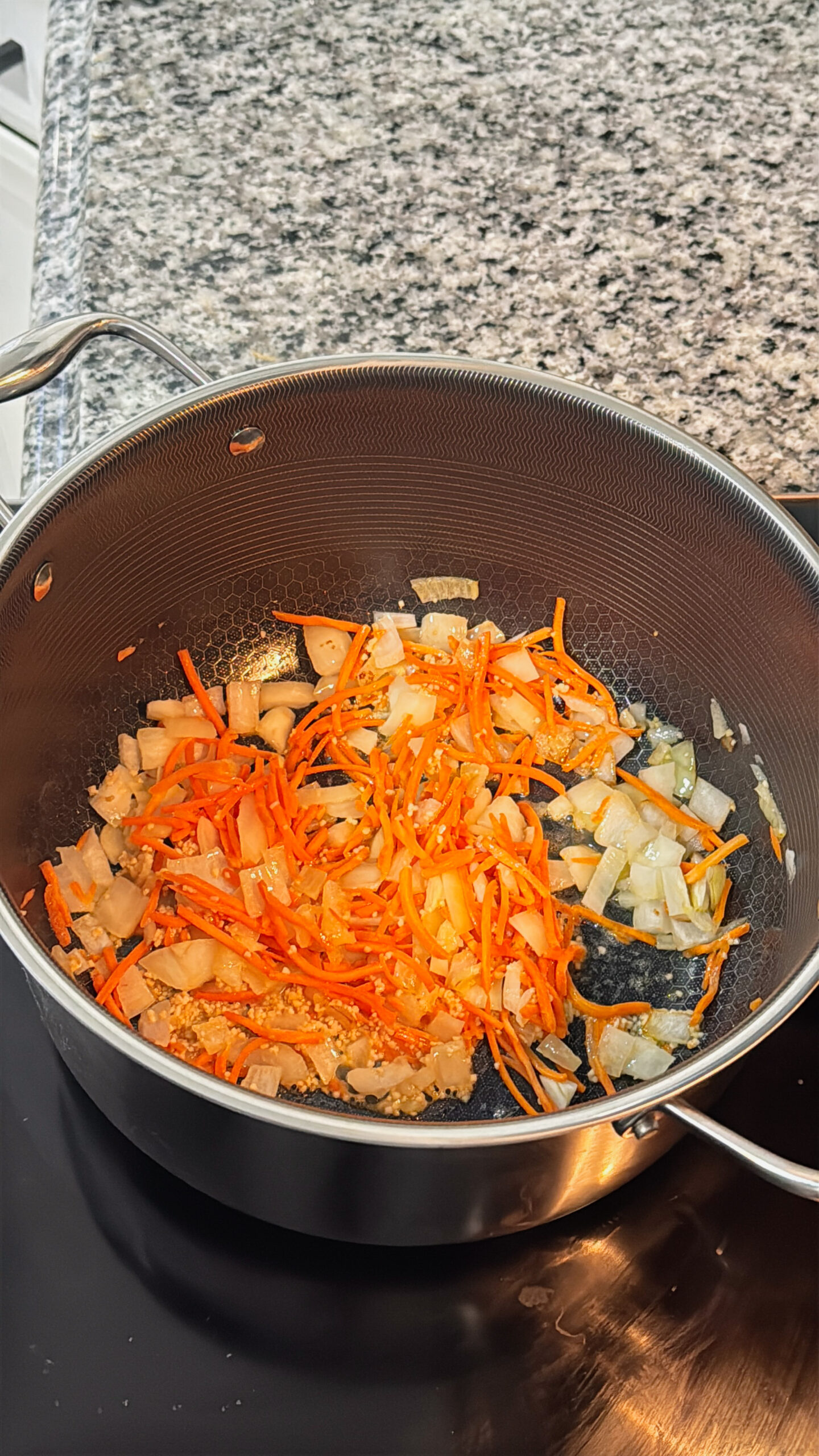 - First, dice the onion and set it aside. Then melt the butter in a large pot over medium heat and sauté the onion, carrots, and garlic until softened and fragrant.