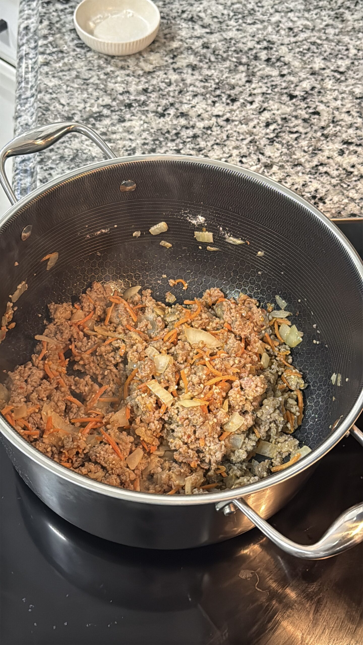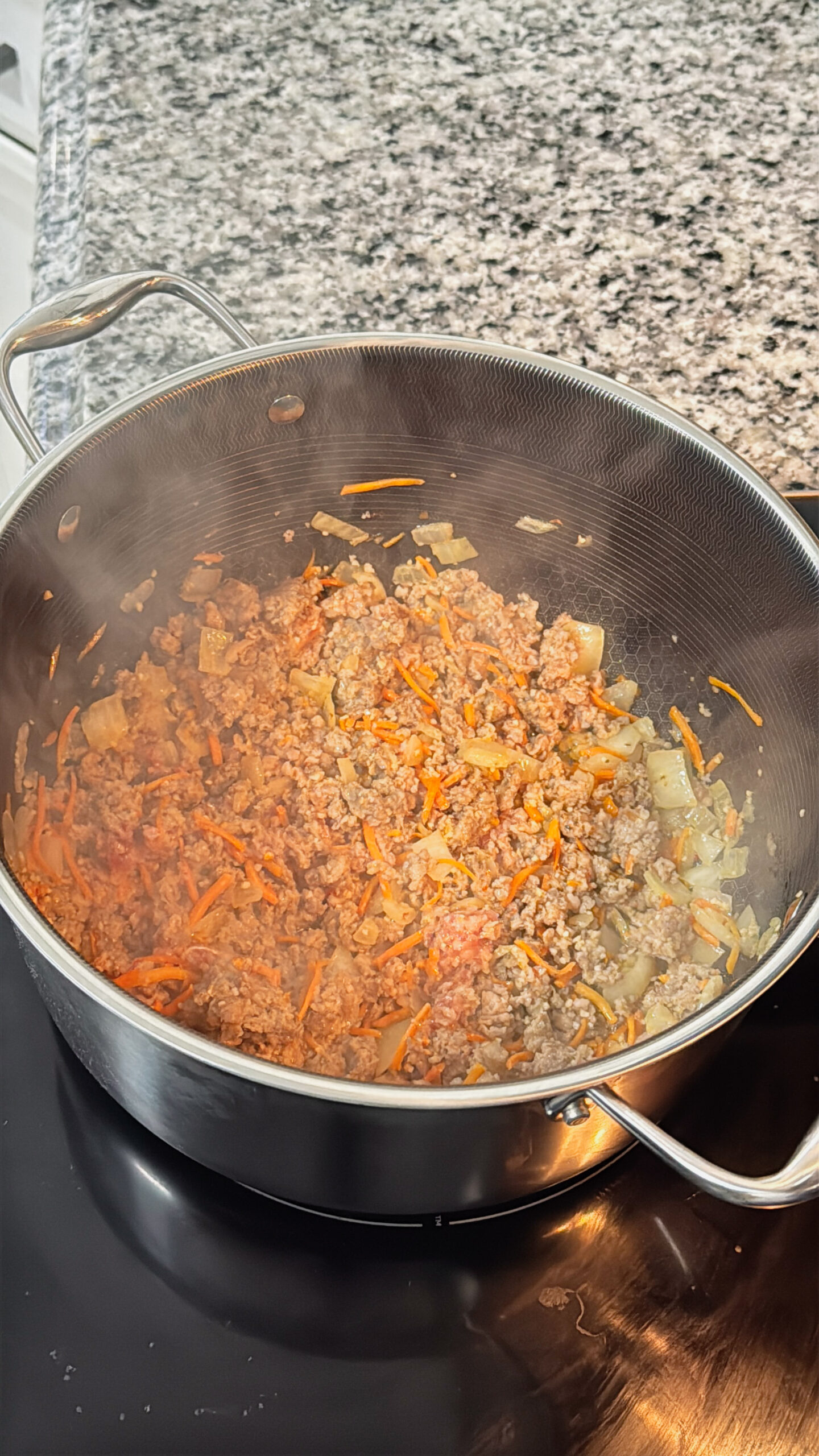 - Next, add the sausage to the pot and cook until fully browned. While it cooks, mix the Better Than Bouillon with 4 cups of warm water until dissolved to create the chicken broth.