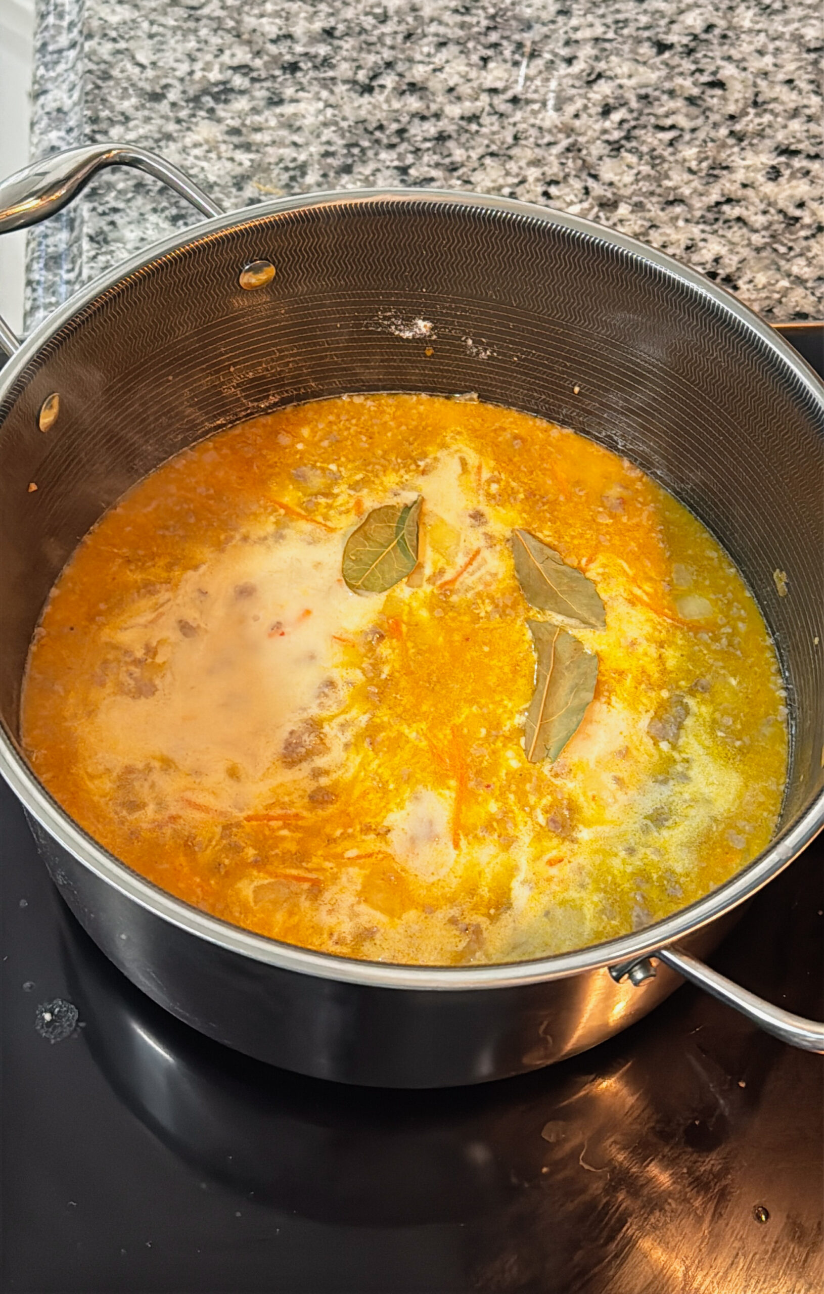 - Step 4: Then slowly pour in the prepared chicken broth, stirring constantly, followed by the heavy cream and bay leaves. Bring the soup to a gentle boil.