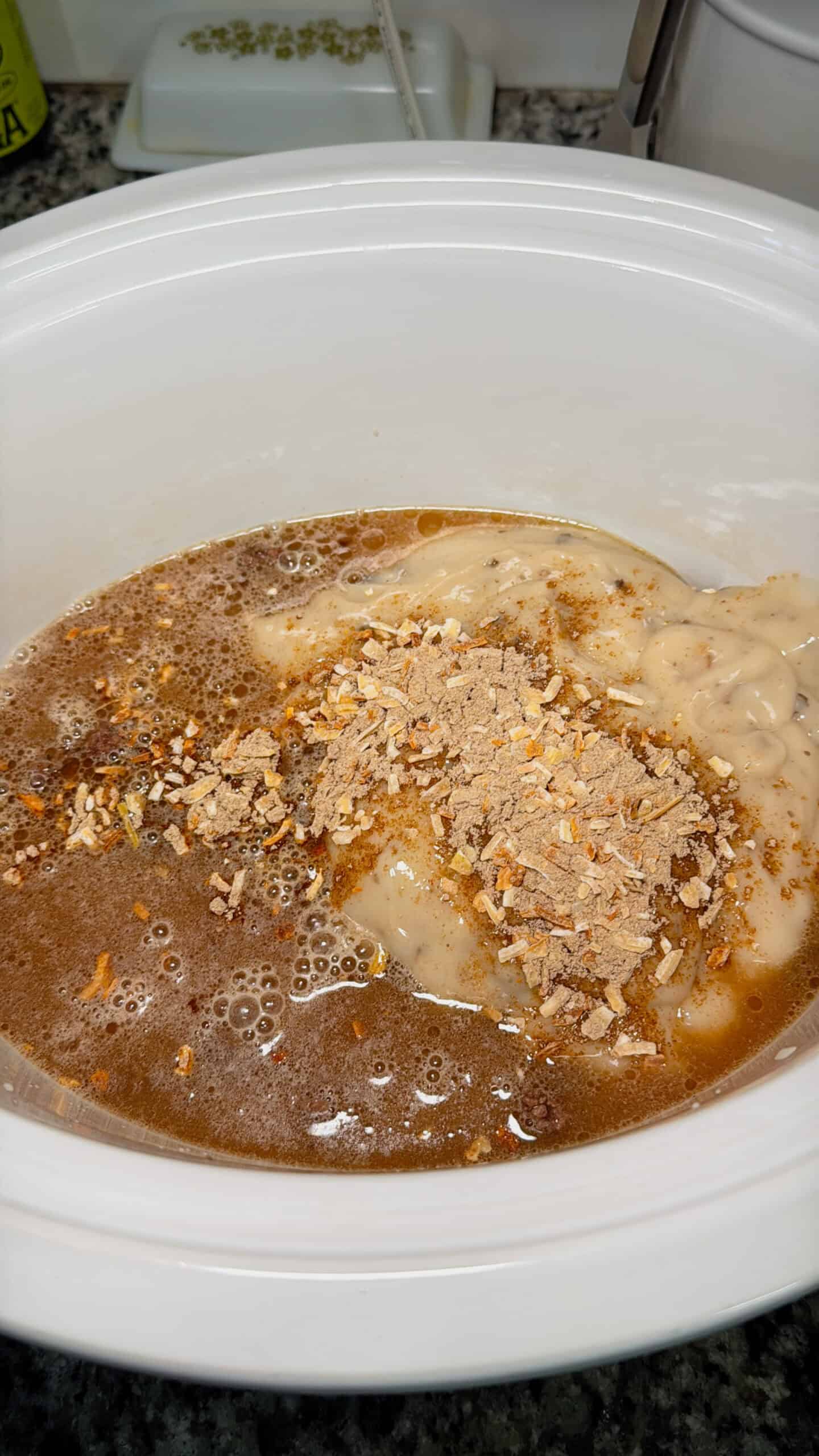 - Step 2: Transfer the cooked ground beef to a large crockpot. Add the minced garlic, beef broth, cream of mushroom soup, and onion soup mix, then stir to combine. Cover and cook on high for 4 hours, allowing the flavors to blend and develop.