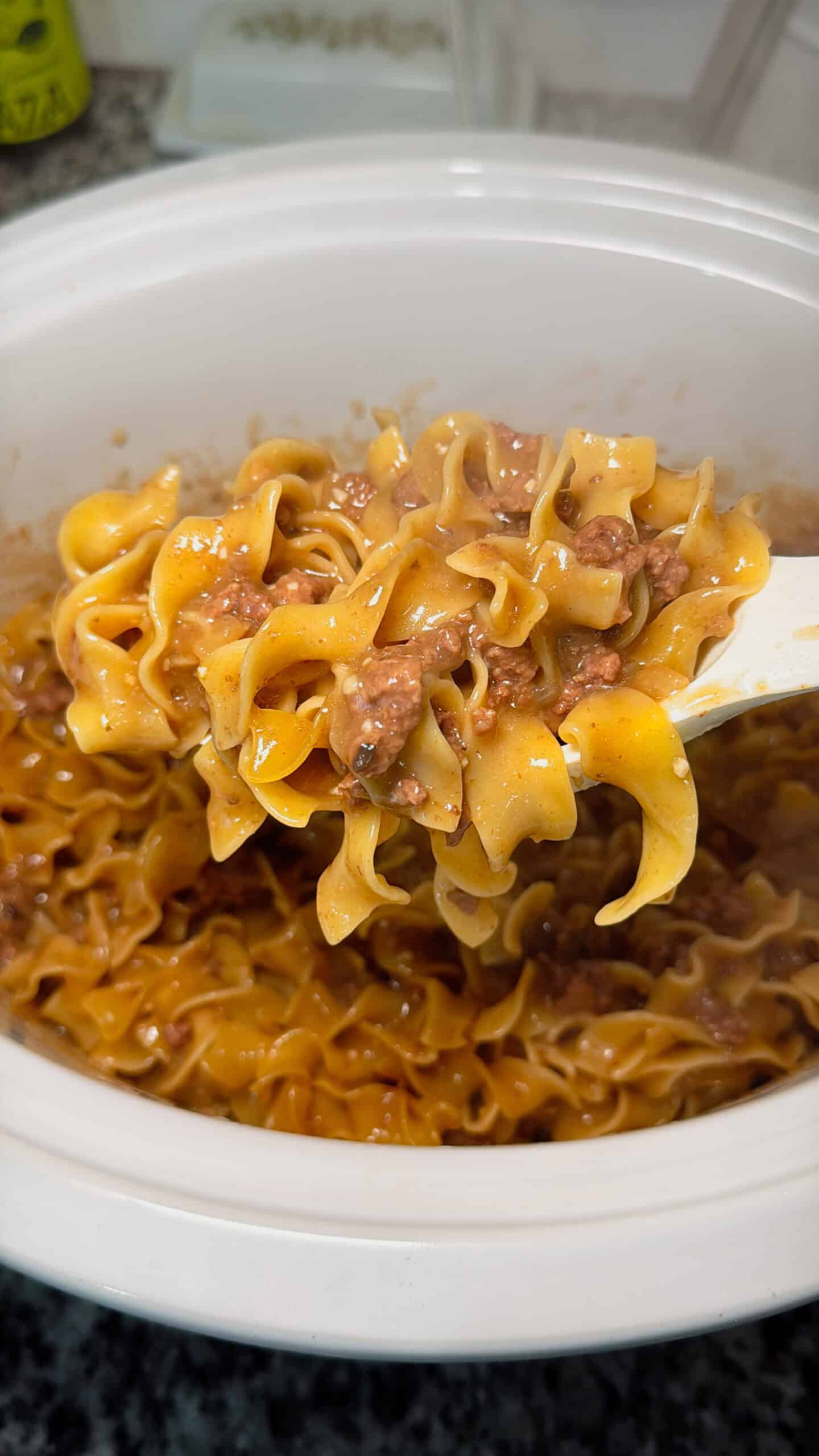 - About 30 minutes before serving, add the egg noodles and stir well to ensure they are fully coated in the sauce. Cover and cook for another 30 minutes, or until the noodles are tender.