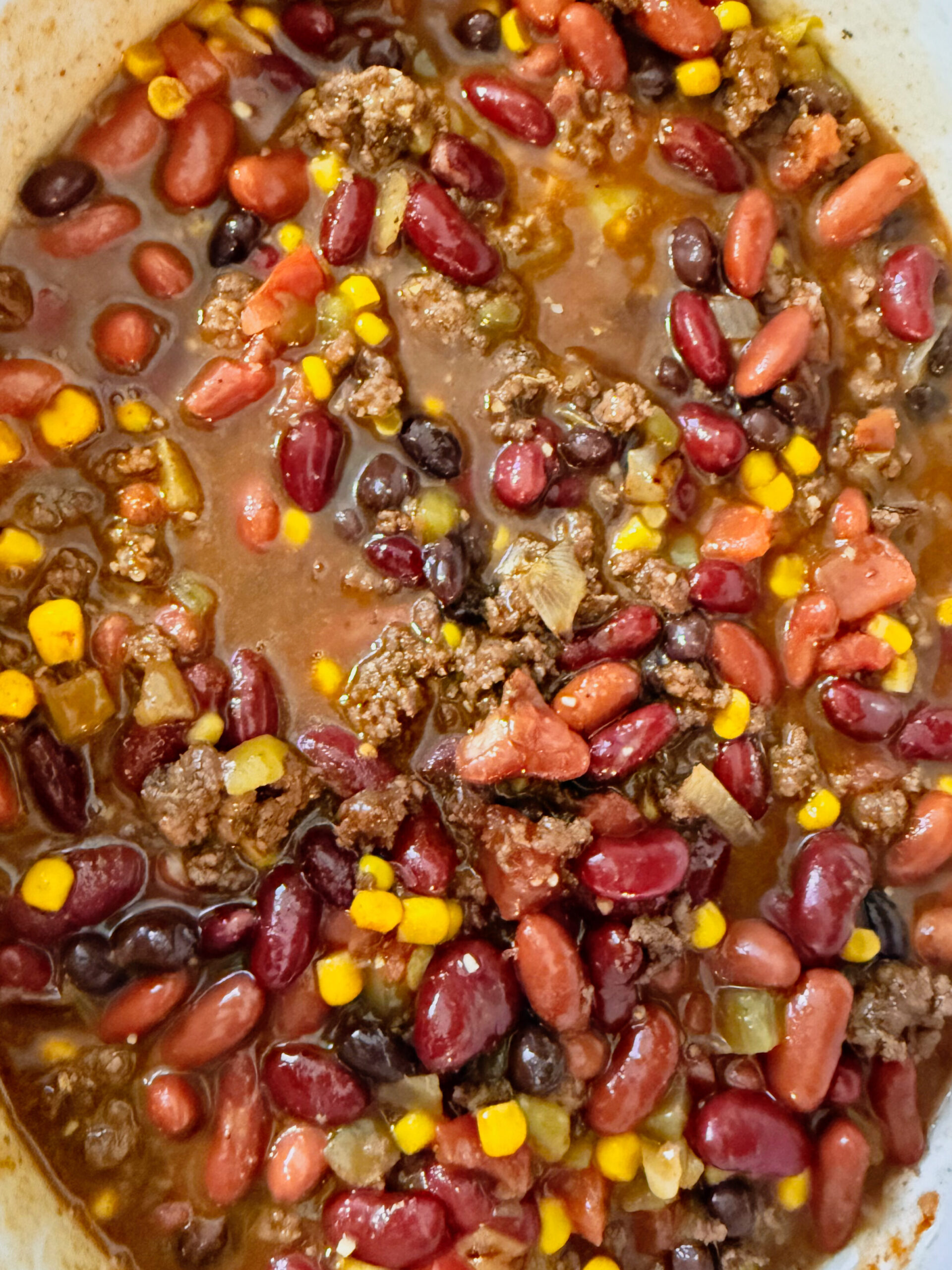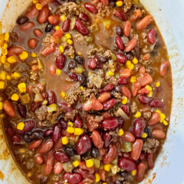 1. Step 1: Add the black beans, dark red kidney beans, light red kidney beans, sweet corn (drained), diced green chilis, and Rotel into a large crockpot/slow cooker. Do not drain out the water in the cans of beans.