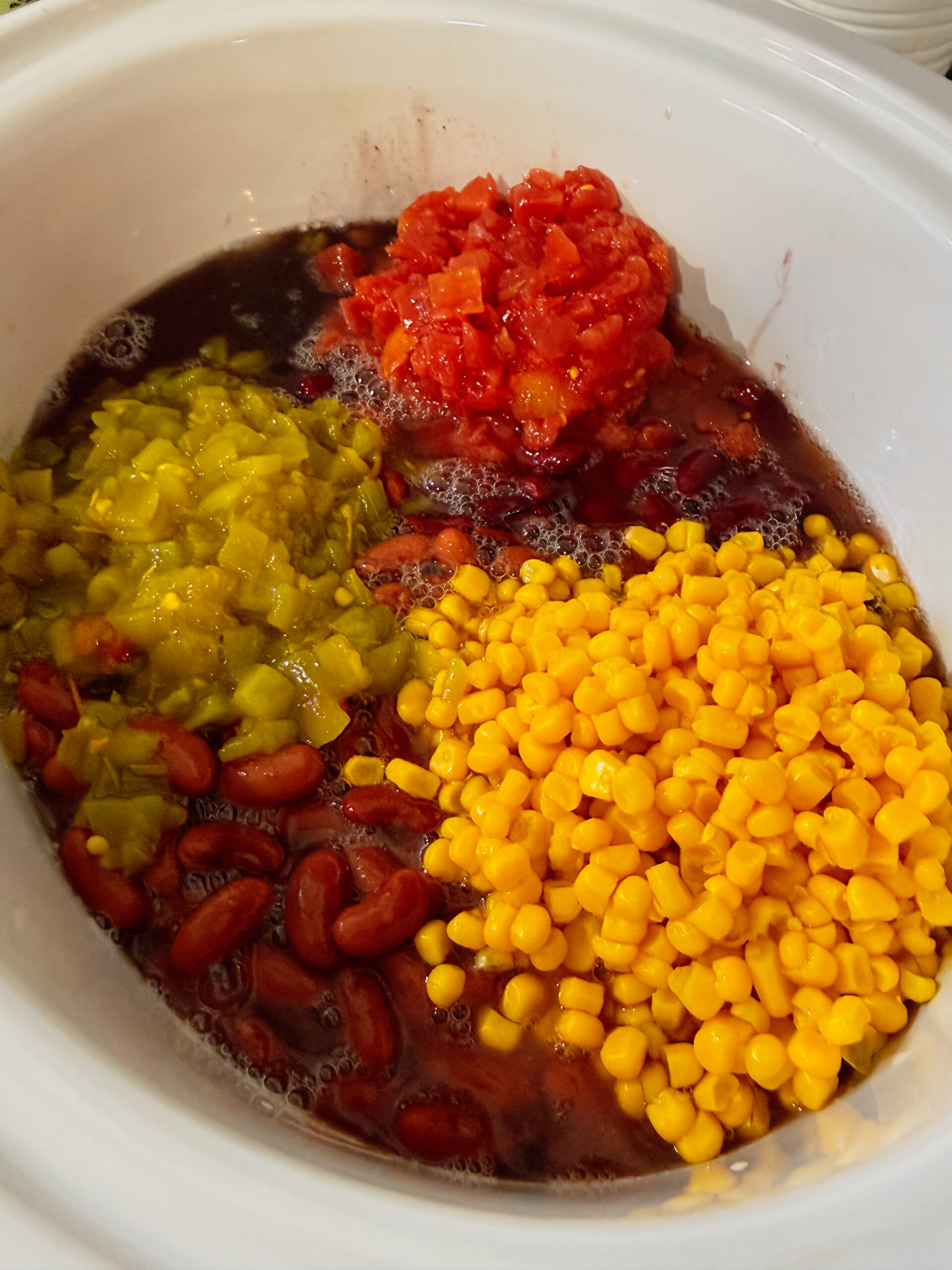 • Step 1: Add the black beans, dark red kidney beans, light red kidney beans, sweet corn (drained), diced green chilis, and Rotel into a large crockpot/slow cooker. Do not drain out the water that is in the can.