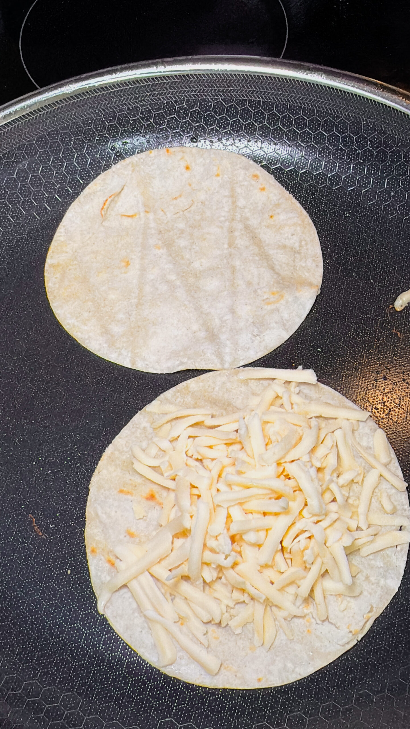 • Heat a skillet over medium heat and fry corn tortillas with cheese inside to make cheesy quesadillas. Flip carefully until the cheese melts and the tortillas turn golden and slightly crisp. Set aside.