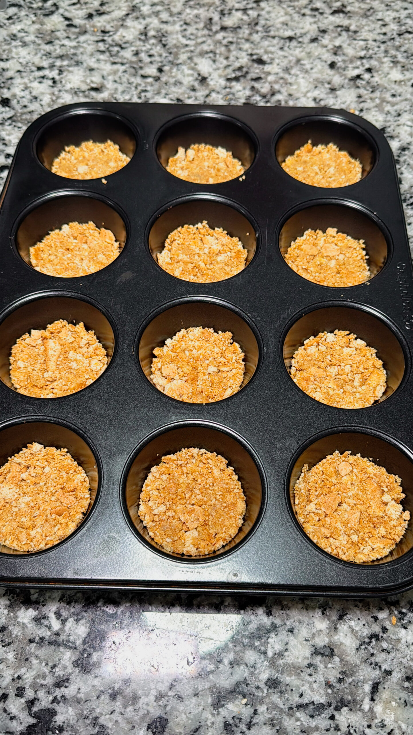 • Next, press the crumb mixture evenly into each muffin cup and bake for 7-8 minutes until golden brown. Remove the pan from the oven and let the crusts cool. Set the oven to 350°F for the next part.