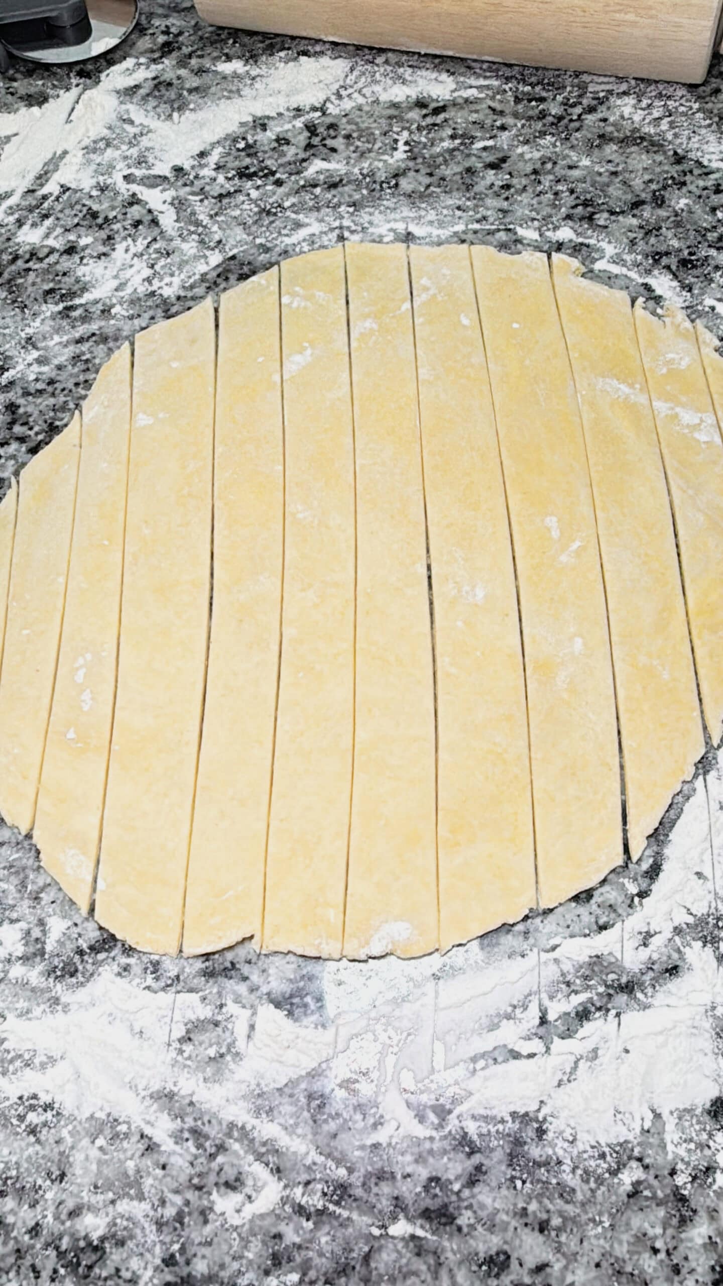 - Step 6: For a lattice top, roll the second portion of dough into a large circle. Then use a pizza cutter to cut several strips of dough and gently weave them back and forth across the top of the pie to create the lattice pattern.