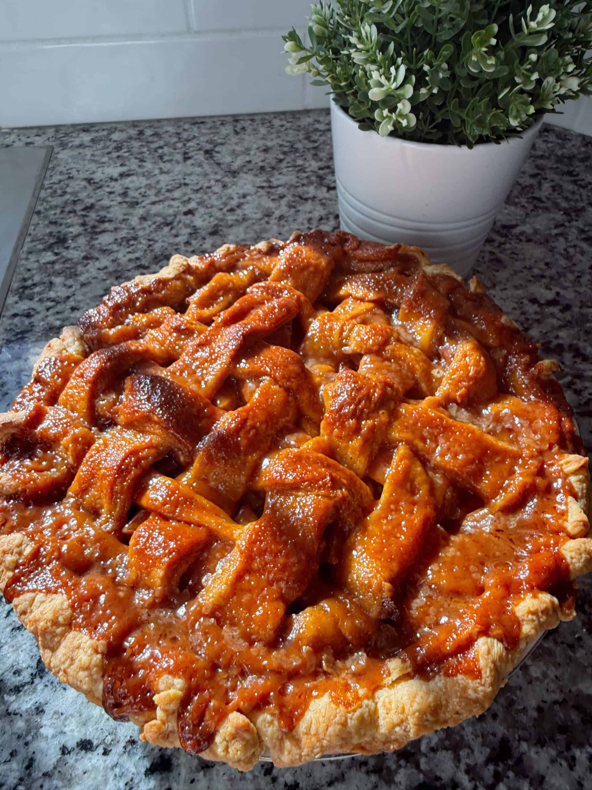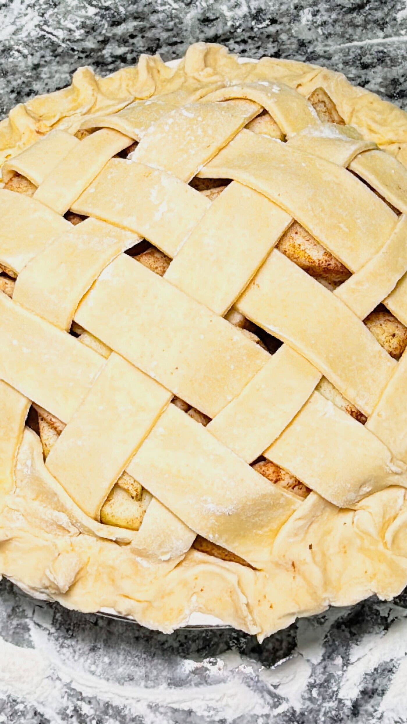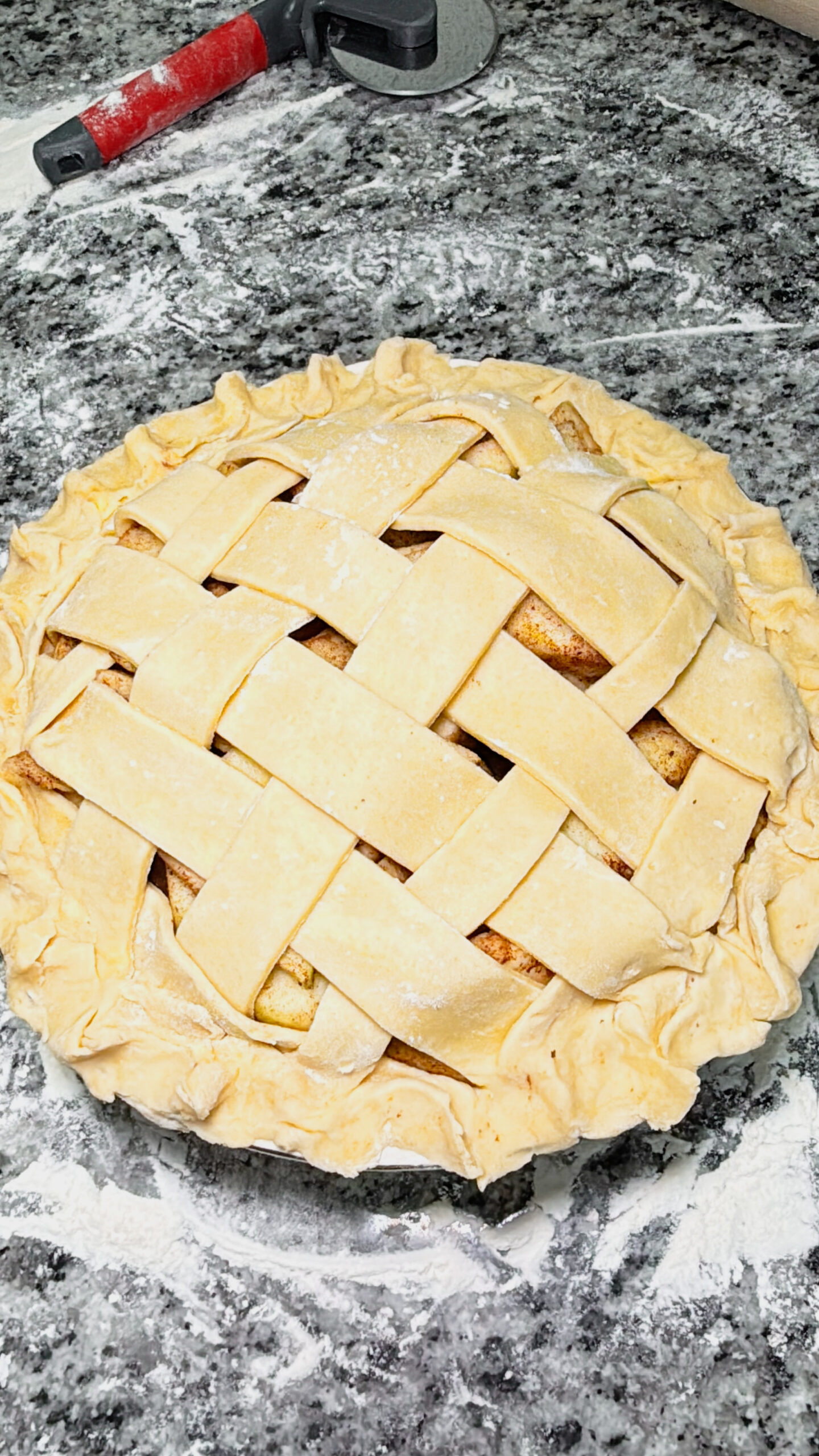 - Step 7: Finally, bake the pie according to the temperature and baking time listed in your pie recipe. Enjoy! (Shown in photo: Smothered Apple Pie - linked here!)