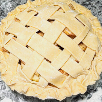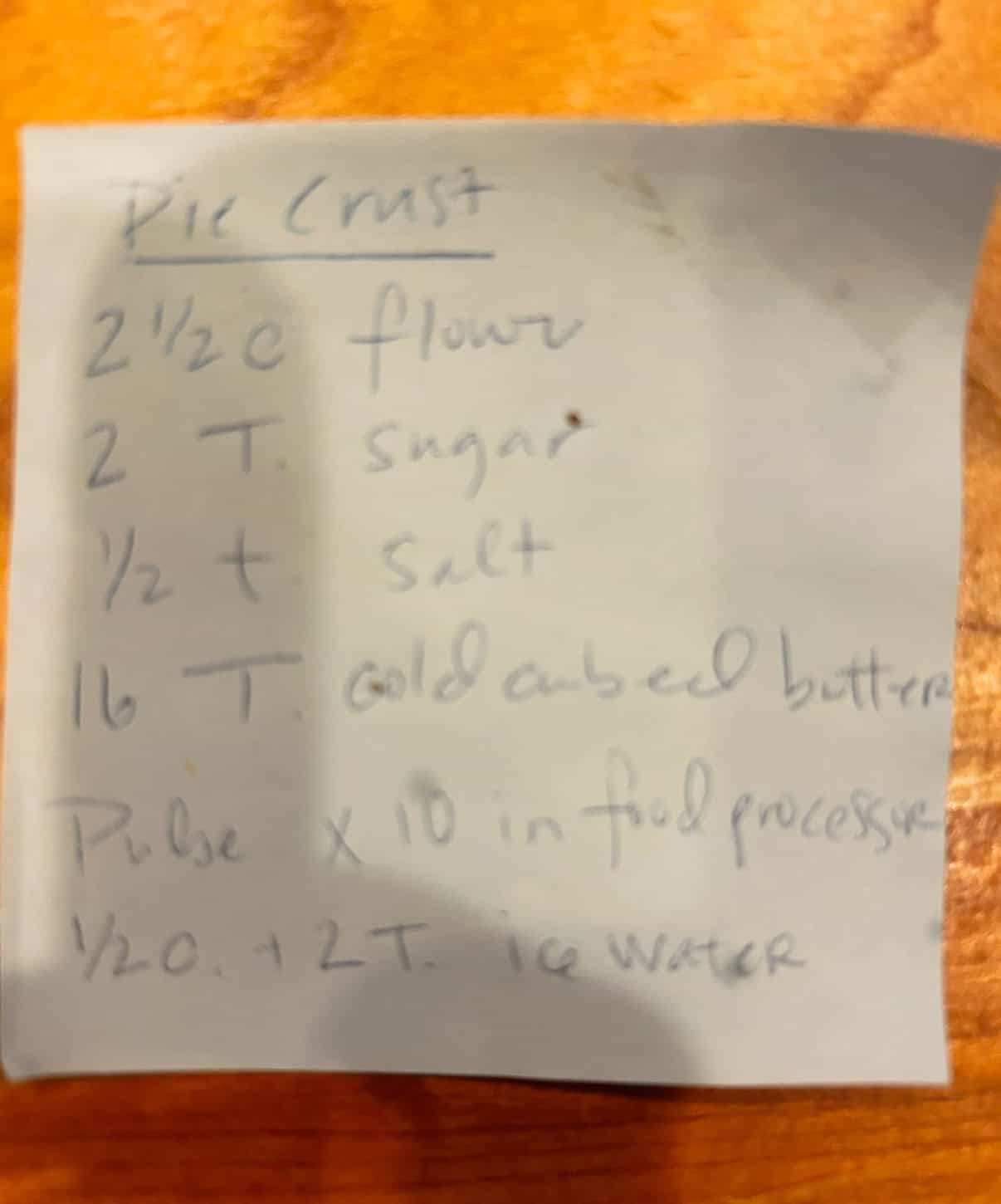 First, I have to share that this recipe comes from my Aunt Naomi. I remember the day I took a blurry picture of the recipe she wrote on a post-it note to save it and make it at home myself! She has used this same pie crust to make both sweet and savory pies. For example, she makes comforting pot pies, classic apple pies (My Recipe for Smothered Apple Pie linked here!), and so many other delicious creations with it. Because the dough holds its shape well, it works great for traditional top crusts and also for beautiful lattice pie crust designs.