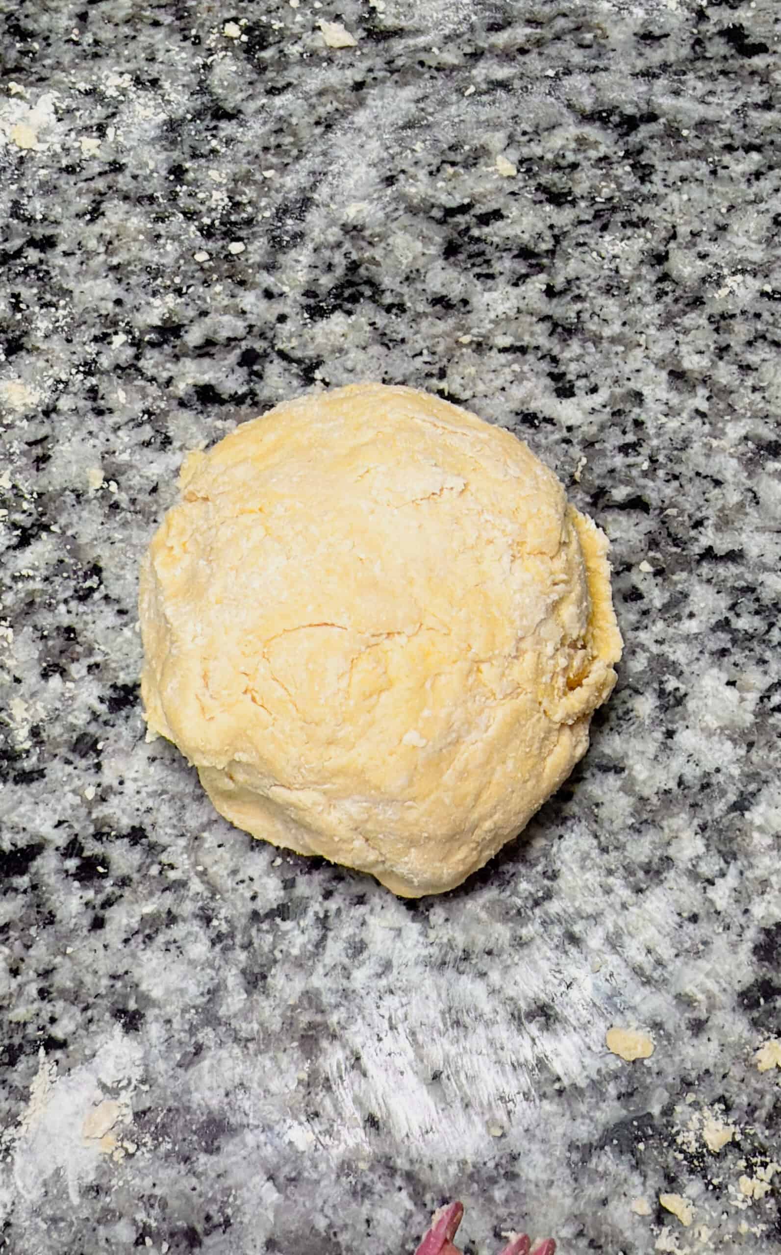 - Next, transfer the dough to a lightly floured surface and use your hands to work the dough together. As you handle the dough, the butter will begin to soften slightly from the warmth of your hands. Continue working the dough until everything fully comes together, then shape it into a ball.