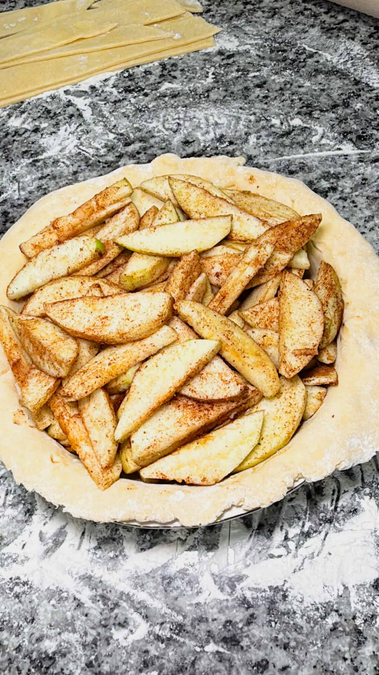 - Place the sliced apples into the bottom crust, forming a slight mound. Lay four strips vertically across the apples, evenly spaced. Weave the remaining strips to form a lattice top using the folding method described in your original recipe. Fold, trim, and pinch edges to secure.
