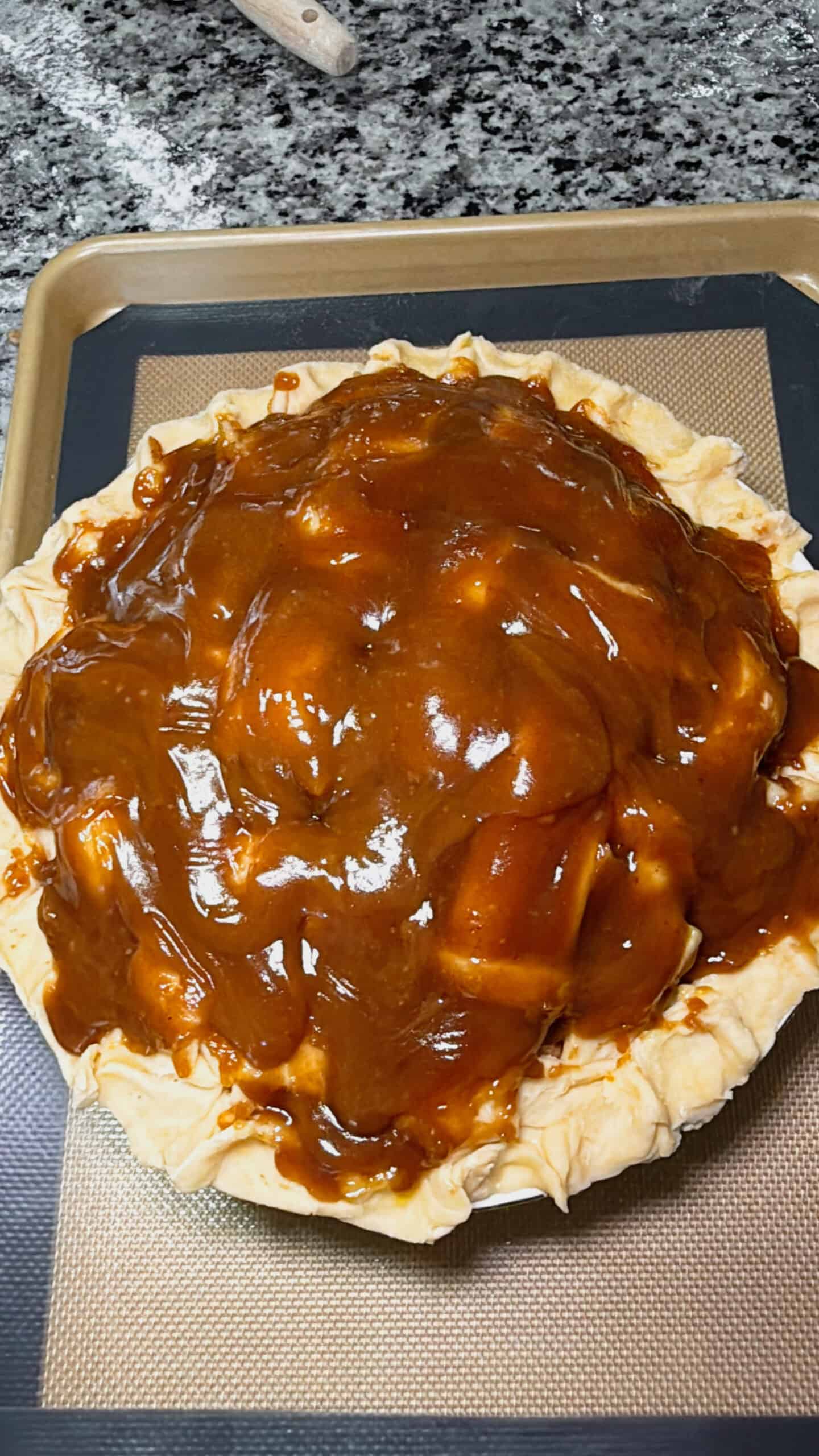 - Step 5: Slowly pour the spiced sugar-butter sauce over the lattice, letting it seep into the apples. Brush some of the sauce onto the lattice but avoid letting it run off the sides. PRO TIP: I like to have a baking sheet under the pie dish in case I have any run down during cooking - no one likes stuff burned at the bottom of the oven!
