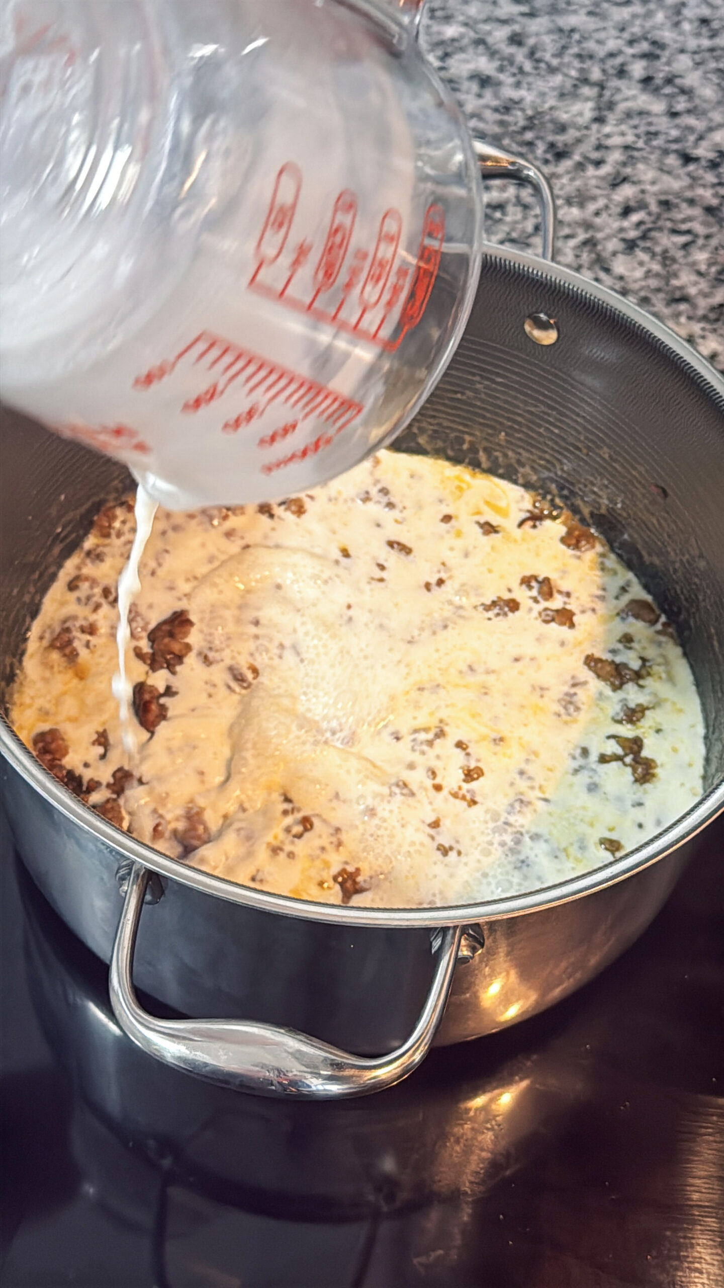- Step 3: Slowly pour in the heavy cream and milk, stirring as it thickens, then season with salt and pepper to taste.