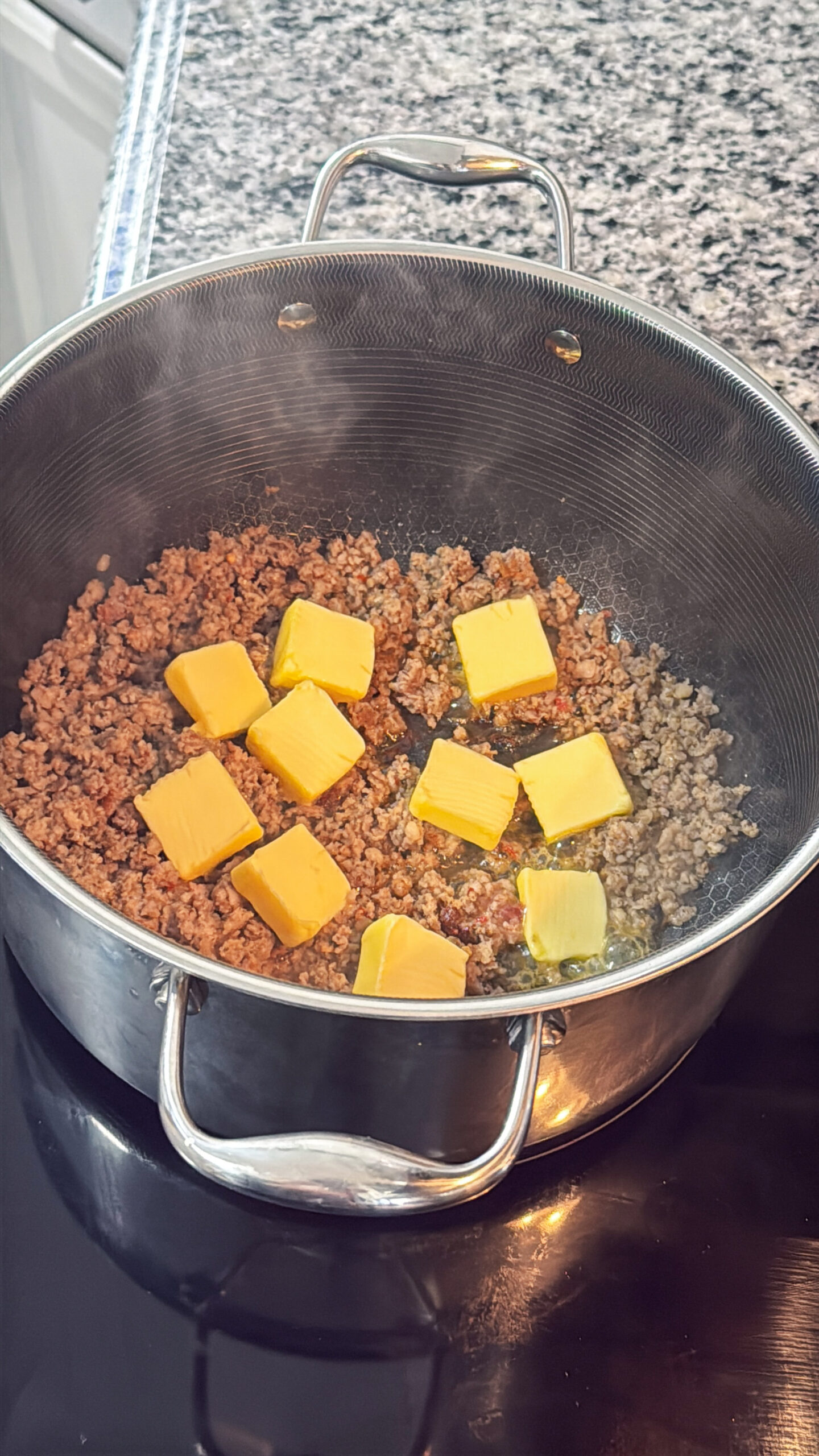 - Brown the sausage in a large pot until fully cooked, then melt in the butter and stir to combine.