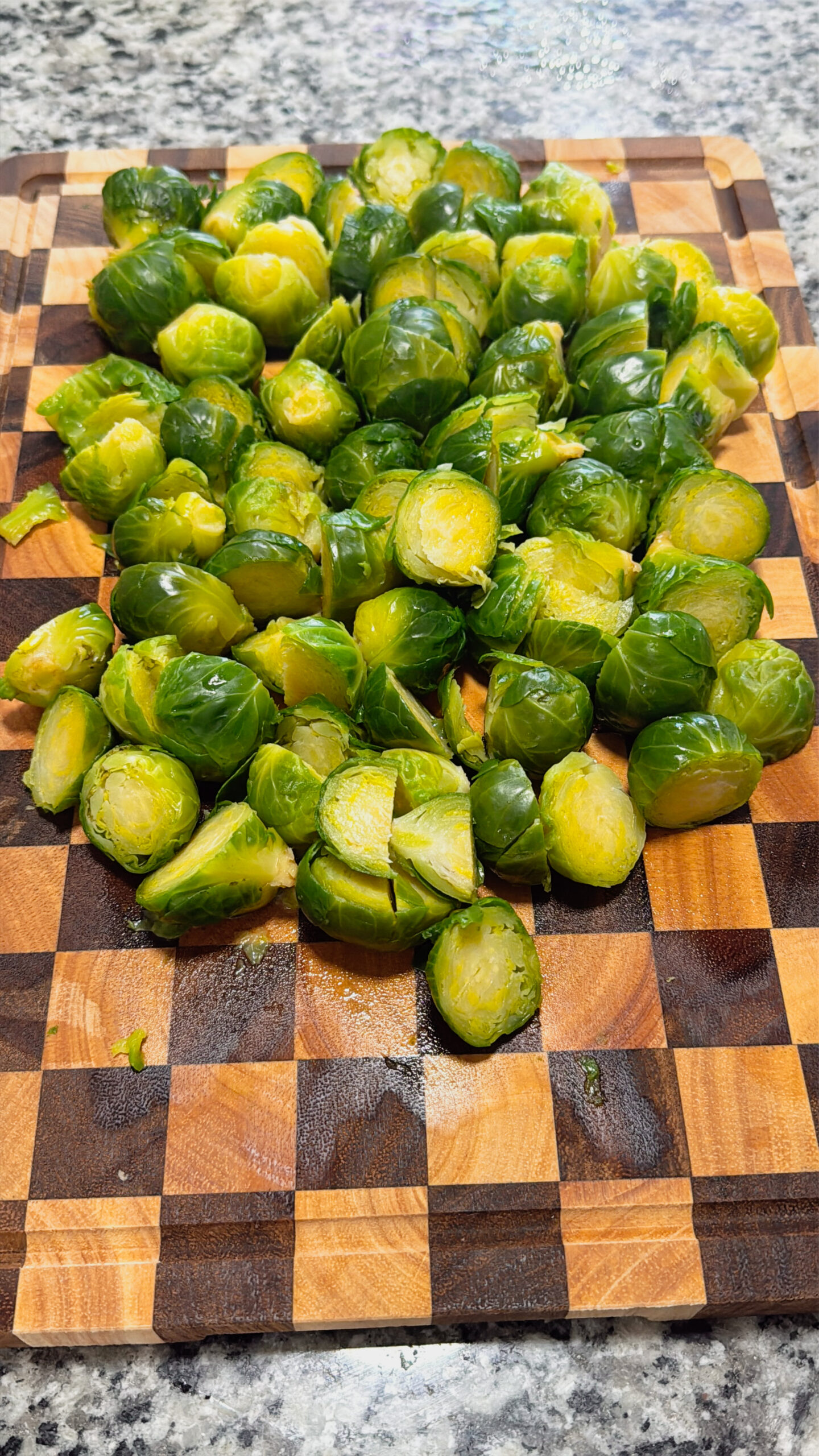 - Step 3: Chop the Brussels sprouts into halves or thirds. Then, transfer them to a large mixing bowl.