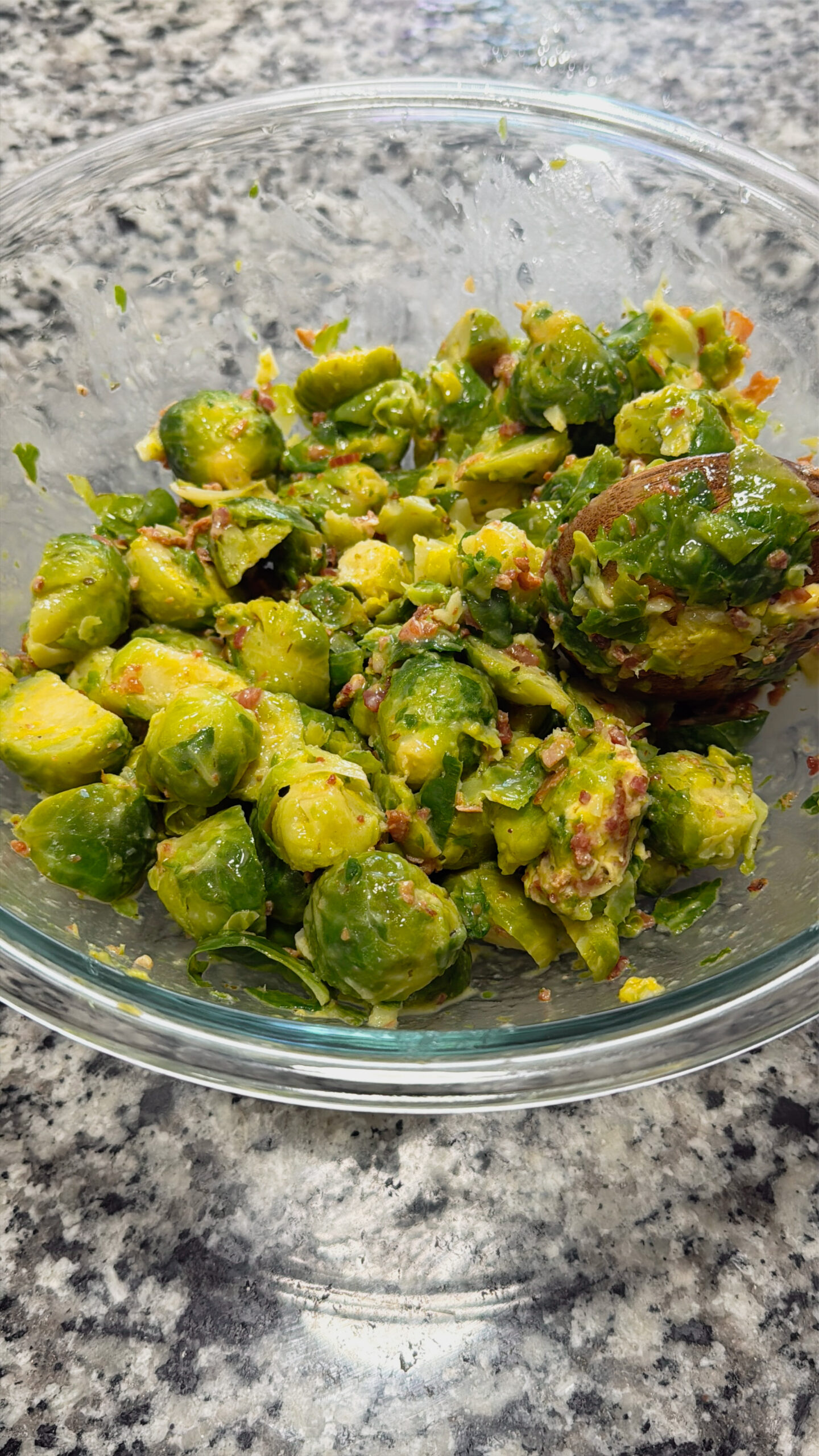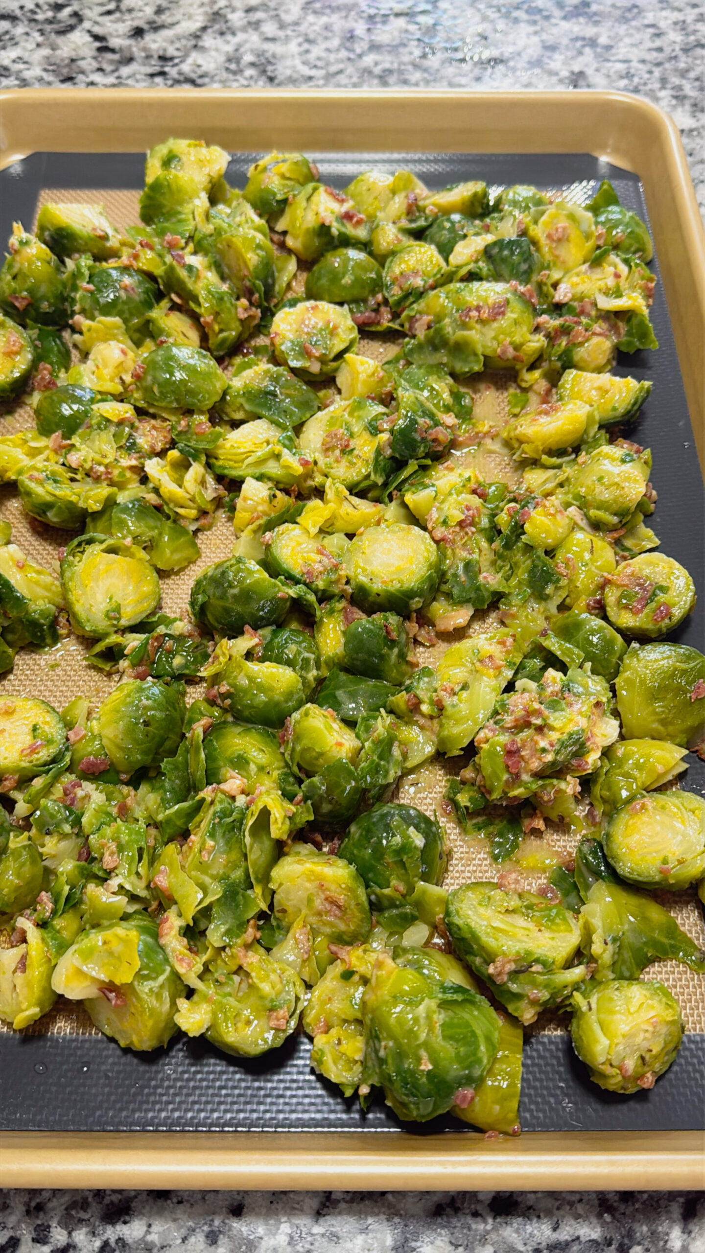 Yes! Cook chopped bacon until crispy, drain the fat, and toss it with the Brussels sprouts just like the bacon bits.