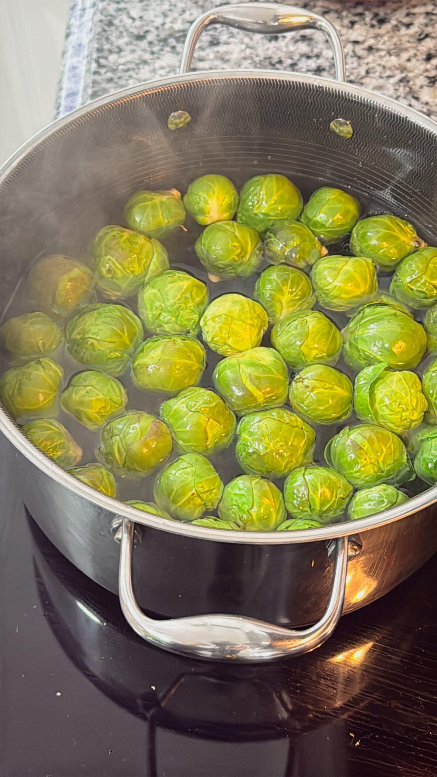 - Preheat the oven to 425°F. Meanwhile, bring a large pot of water to a boil and cook the Brussels sprouts until tender.